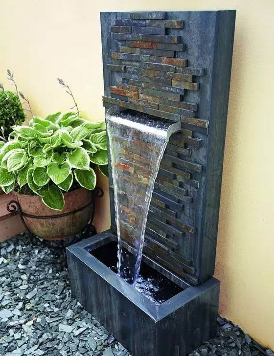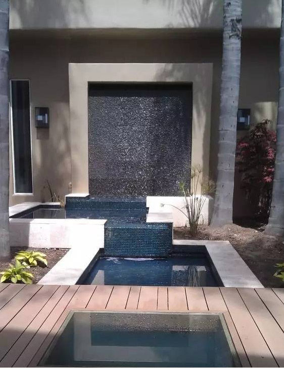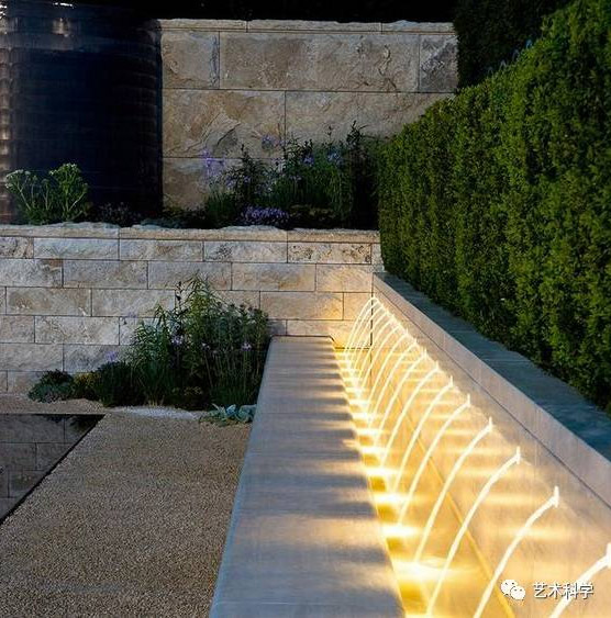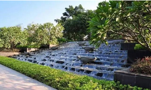 跌水是指規(guī)則形態(tài)的落水景觀,多與此同時建筑、景墻、擋土墻等結(jié)合,跌水表現(xiàn)了水的墜落之美。